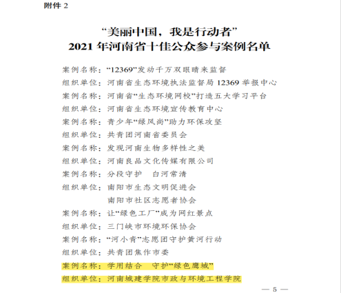 (通讯员:杨冰 邢智洋)6月2日,河南省2021年六五环境日系列宣传活动开幕式暨表彰大会在河南省生态环境厅三楼会议室举行,会上揭晓了“河南出彩环保人”、十佳环保设施开放单位、十佳公众参与案例、生态环境优秀创意作品和优秀摄影作品。河南省政协副主席朱焕然,河南省生态环境厅党组书记、厅长王仲田,河南省人大环资委主任委员、常委会环资工委主任朱长青,河南省委宣传部二级巡视员牛素玲、河南省教育厅副总督学黄才华分别为获奖单位和个人颁奖。由公司mobile28365申报的“学用结合守护绿色鹰城”案例荣获河南省2021年十佳公众参与案例并在主会场接受表彰。