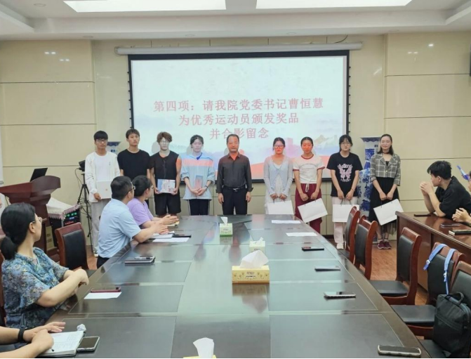 表彰会上,曹恒慧为优秀运动员颁发荣誉证书和奖品,姜忠峰为优秀志愿者颁发荣誉证书并与同学们合照留念。